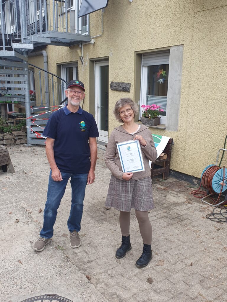 Die kleine Paula steckte den Schukostecker in die Steckdose und der Strom fließt ab jetzt in das Stromnetz der Kita. Danach übergab unser Vorstand August Schlaphorst ein Zertifikat an Frau Ossiek.