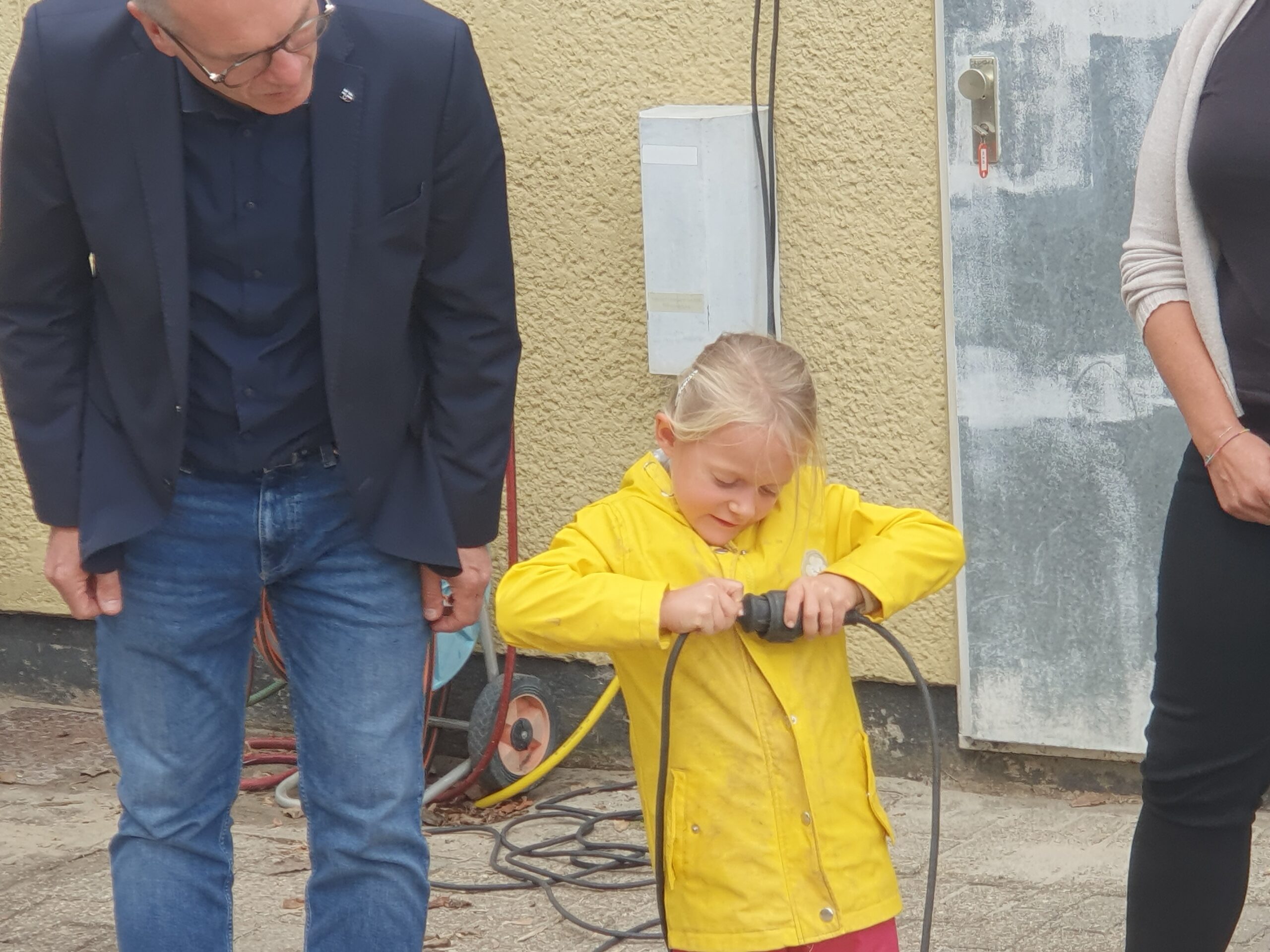 Die kleine Paula steckte den Schukostecker in die Steckdose und der Strom fließt ab jetzt in das Stromnetz der Kita. Danach übergab unser Vorstand August Schlaphorst ein Zertifikat an Frau Ossiek.